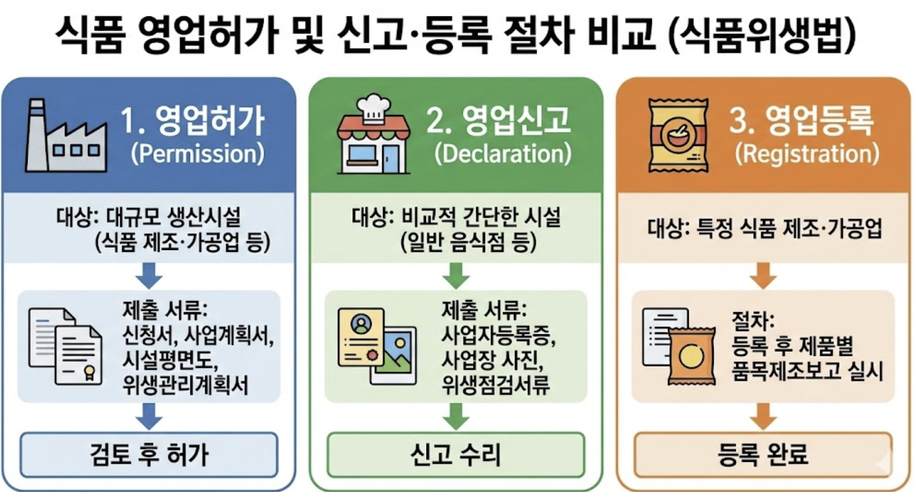 식품 관련 영업은 식품위생법에 따라 영업 종류에 따라 허가·신고·등록으로 구분됩니다.^12