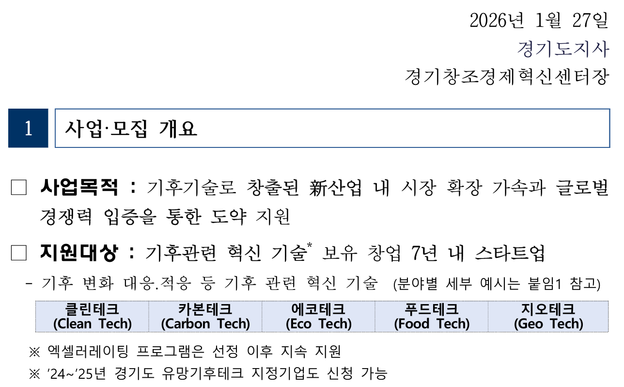 | 지원 대상 | 예비 창업자 ~ 업력 7년 이내 기후테크 스타트업 |