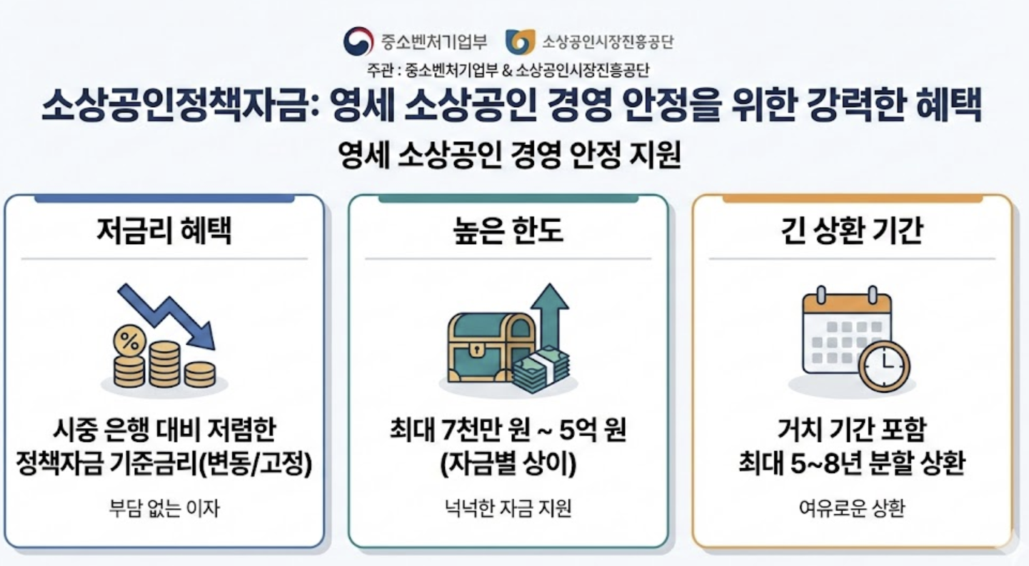 소상공인정책자금은 중소벤처기업부와 소상공인시장진흥공단이 주관하는 정부 지원 사업입니다. 영세 소상공인의 경영 안정을 위해 마련된 자금인 만큼 혜택이 강력합니다.