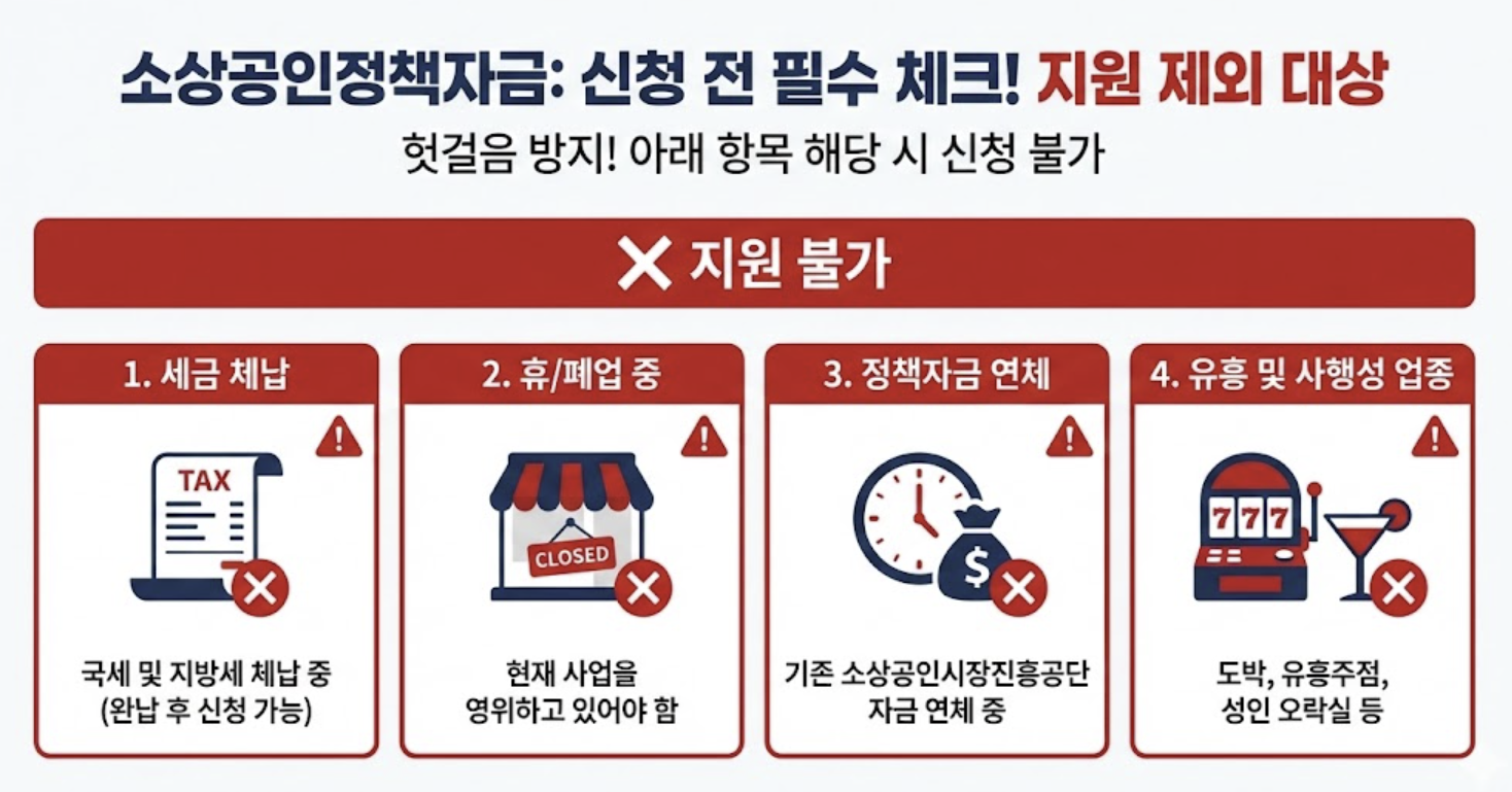 - 정책자금 연체: 기존 소상공인시장진흥공단 자금을 연체 중인 경우