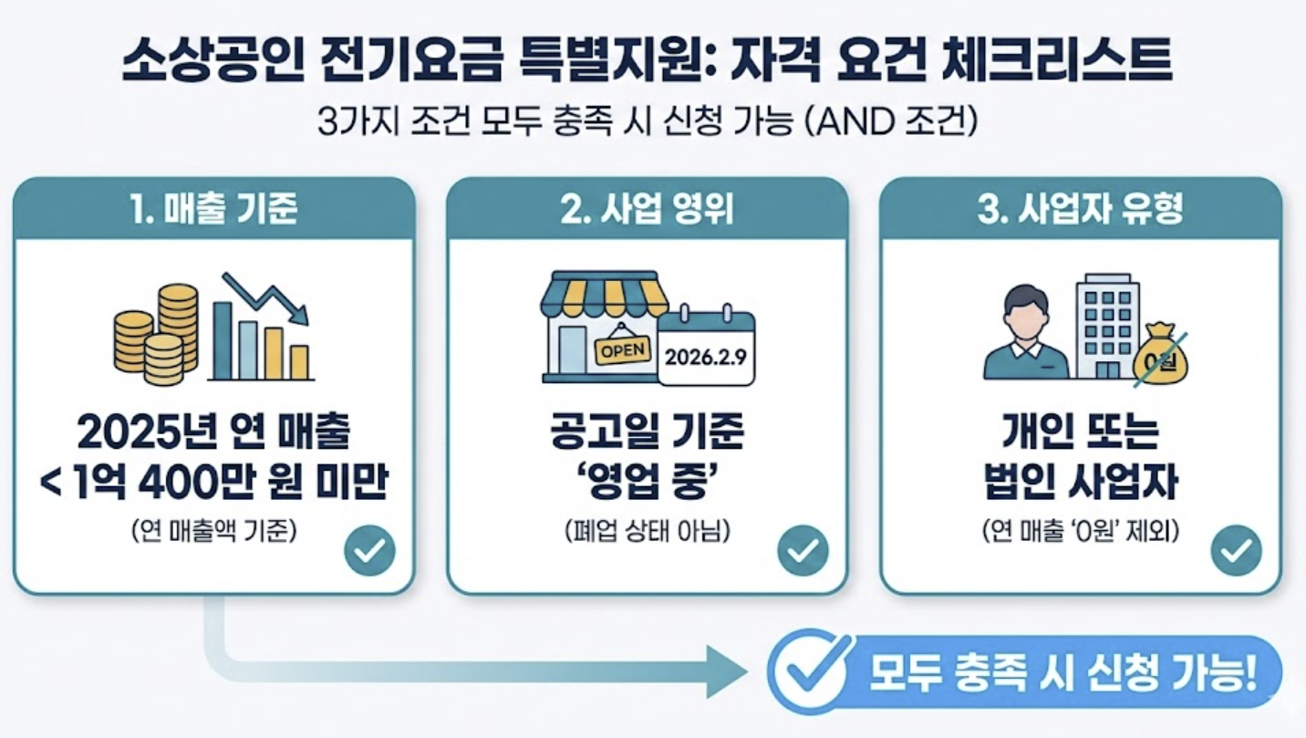 - 사업 영위: 공고일(2026.2.9) 기준 폐업 상태가 아닌 영업 중인 소상공인.