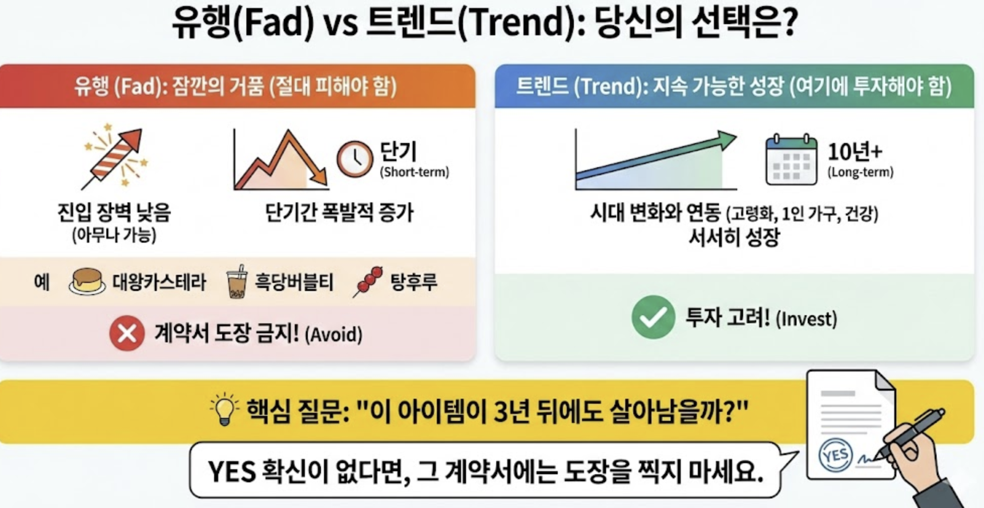 - 유행(Fad): 진입 장벽이 낮고(아무나 할 수 있음), 단기간에 폭발적으로 매장이 늘어남. (예: 대왕카스테라, 흑당버블티, 탕후루) -> 절대 피해야 함.