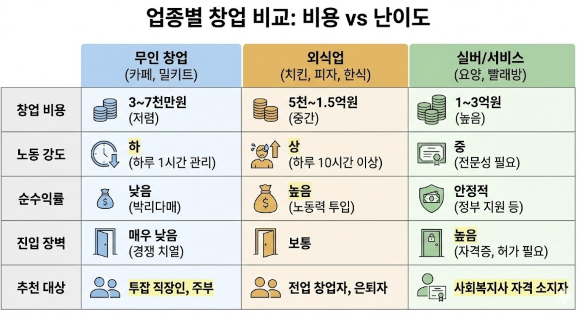 3. 업종별 창업 비용 및 난이도 비교