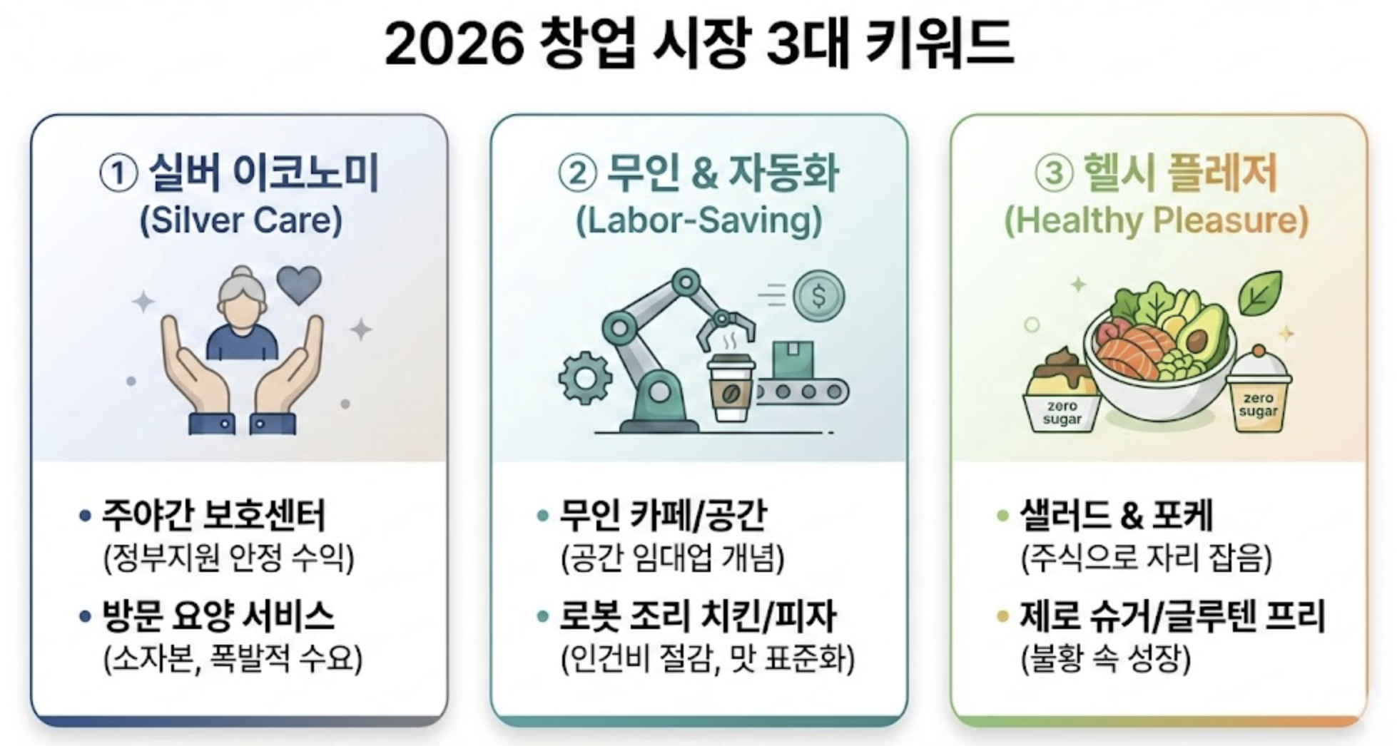 - 2026년은 실버 케어, 무인 자동화, 헬시 플레저가 주도하는 시장이다.