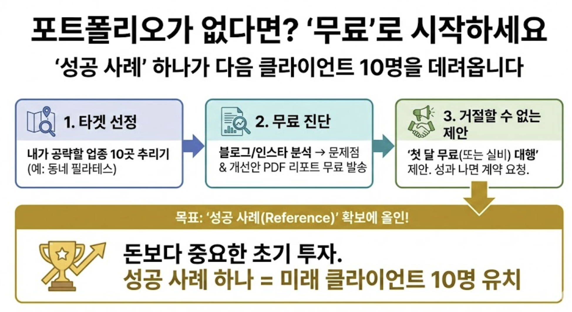 이 과정에서 '거절할 수 없는 제안'을 던지는 것이 핵심입니다. 돈을 벌려고 하지 말고, '성공 사례(Reference)'를 하나 만드는 데 목숨을 거세요. 그 성공 사례 하나가 다음 클라이언트 10명을 데려옵니다.