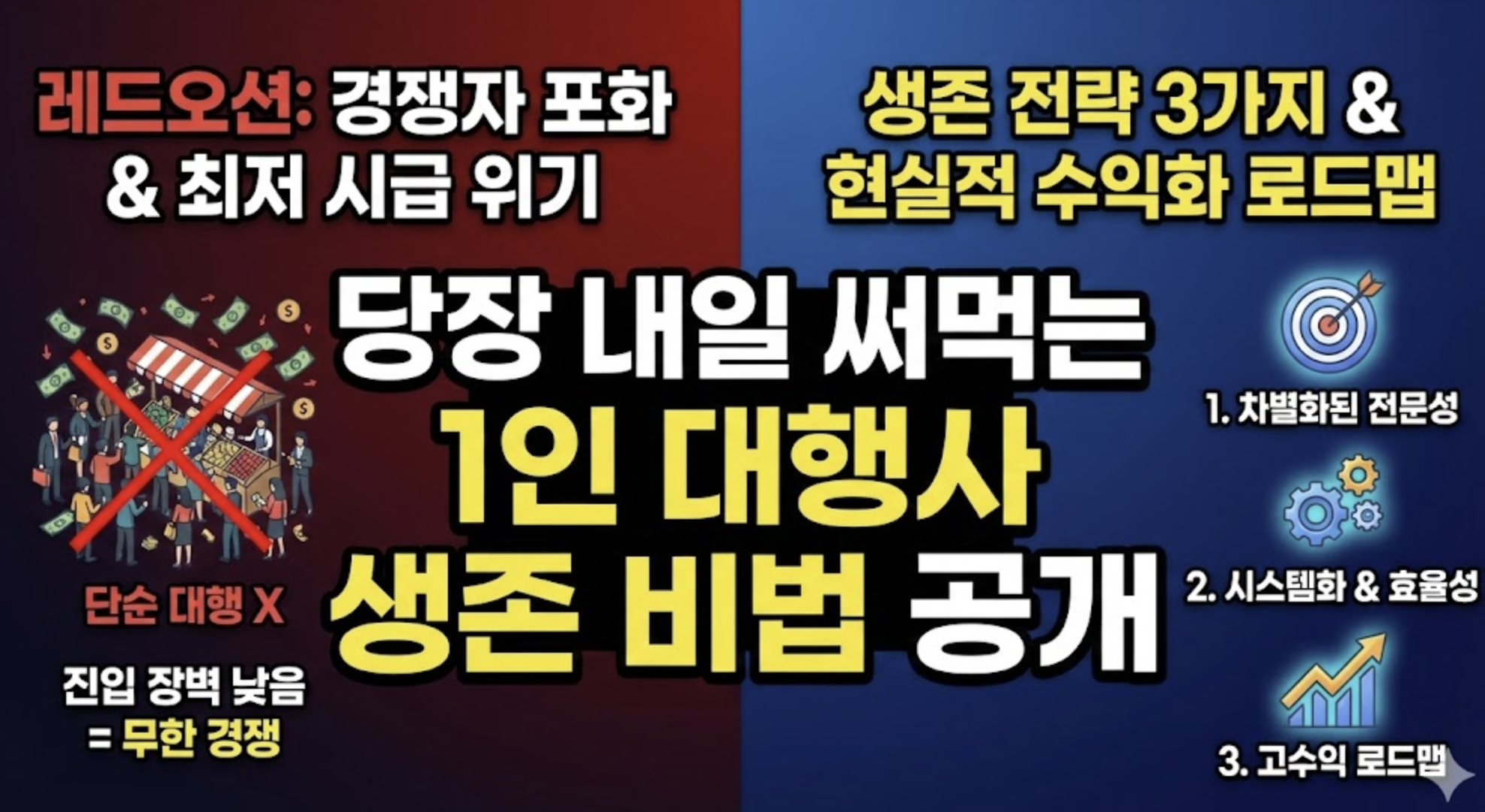 | 추천 전략 | 자본이 많은 대형 대행사 | 1인 창업 / 소규모 팀 |