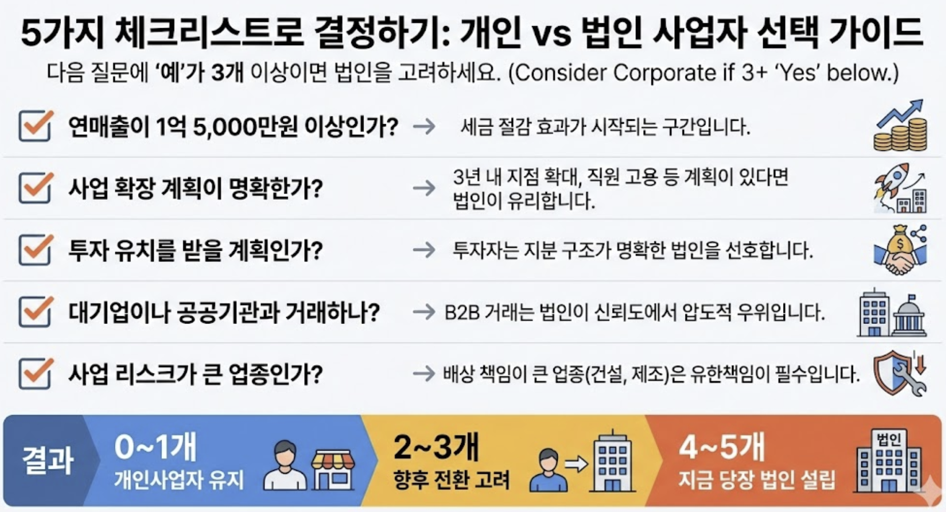 다음 질문에 "예"가 3개 이상이면 법인을 고려하세요.
