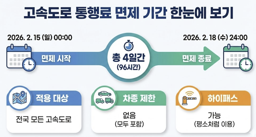 명절 귀성길, 기름값에 톨비까지 부담되셨죠? 2026년 설 연휴에는 전국 고속도로 통행료가 4일간 완전 면제됩니다. 2월 15일 자정부터 18일 자정까지, 정확히 96시간 동안 모든 차량이 무료로 고속도로를 이용할 수 있습니다.